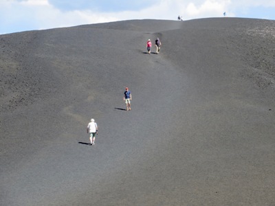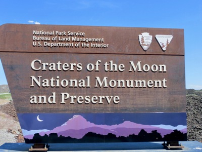 It re Eventually we came to the Craters of the Moon National Monument and went in. We spent a little time in the Visitor Centre looking at the exhibitions and watching a short film. Les took the opportunity to put on more sunscreen before we ventured back out. We drove around the Loop stopping to do the North Crater trail and Les walked up the Inferno Cone. At the top Les was alone apart from a young couple. He asked them to take his photograph to prove that he’d made it to the summit. They turned out to be two young Iranians living in Mississippi. Les walked all the way back down with them chatting. They were amused that Les found it so hot (93F) and he explained that this was virtually unknown in England. They did tell us that there had been an ISIS attack in Iran with over 20 people dead and they told us that they regarded the BBC World Service as the most reliable and accurate source of news. We would’ve done a couple more of the trails but when the sun was out it was just too punishingly hot for us so we finished the loop drive and drove the last 19 miles to Arco. The motel is very simple but clean and relatively cheap. There isn’t tea and coffee making in the room but we managed to ‘boil’ some water in the microwave in order to make a much needed cup of tea. Had our dinner in our room with the salads we’d bought this morning and treated ourselves to a beer each. After we’d downloaded photos and done most of the day’s diary Anne sat and read while Les watched some British TV via the iPad. When we went to bed we couldn’t keep the aircon on even though the room was very warm because the aircon was too noisy. We resorted to opening the window a little and slept reasonably well in the end |
